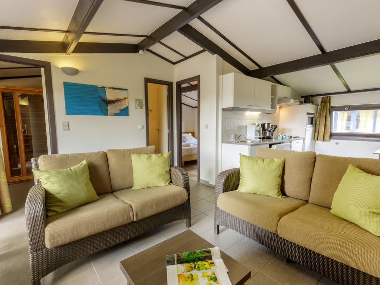 "Exclusive", huis 2-kamers 59 m2. Doelmatig ingericht: woon-/eetkamer met eettafel en Flatscreen TV. Uitgang naar het terras. 1 2-pers. kamer met 2 bedden en Flatscreen TV. Open keuken (4-pits kookplaat, afwasmachine, magnetron, elektrische koffiemachine). Bad/WC. Terras. Terrasmeubelen. Ter beschikking: sauna, kluis, kinderstoel, kinderbed. Let op: rookmelders.