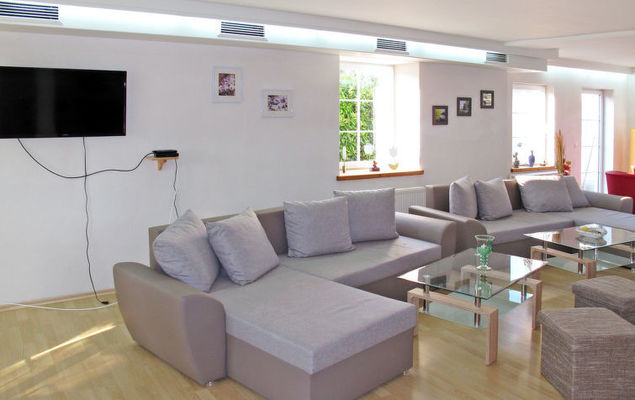 Huis 9-kamers 360 m2 op 3 verdiepingen. Licht, modern en smaakvol ingericht: groot woonkamer met eettafel, bar, Sat-TV, radio, CD-speler en DVD. Uitgang naar het terras. Kleine keuken (4-pits kookplaat, oven, afwasmachine, broodrooster, waterkoker, magnetron, diepvriezer, elektrische koffiemachine). 2 aparte WC's. Bovenverdieping: woon-/slaapkamer met 2 bedden en Sat-TV. Uitgang naar het balkon. 1 2-pers. kamer met bad/douche/WC en Sat-TV. 2 2-pers. kamers, elke kamer heeft Sat-TV. Open keuken (oven, afwasmachine, 4 keramische glas kookplaten, broodrooster, waterkoker, magnetron, elektrische koffiemachine) met kleine bar. Bad/WC, douche/WC. Zolderverdieping: 1 kamer met afgeschuinde daken met 4 bedden en Sat-TV. 2 kamers met afgeschuinde daken, elke kamer heeft 1 bed, 1 2-pers bed en Sat-TV. 1 2-pers. kamer met afgeschuinde daken. 3 douche/WC's. Gas-verwarming. Balkon, terras. Terrasmeubelen, ligstoelen (4). Ter beschikking: Internet (Internet (WiFi), gratis). Let op: rookvrij huis. Rookmelders, brandblusser. Bij boeking voor een prijs voor 12 personen niet beschikbaar: 3 slaapkamers. Bij boeking voor een prijs voor 14 personen niet beschikbaar: 2 slaapkamers. Als er minder dan het maximale aantal gasten in de accommodatie verblijft, zijn niet alle slaapkamers beschikbaar voor gebruik.