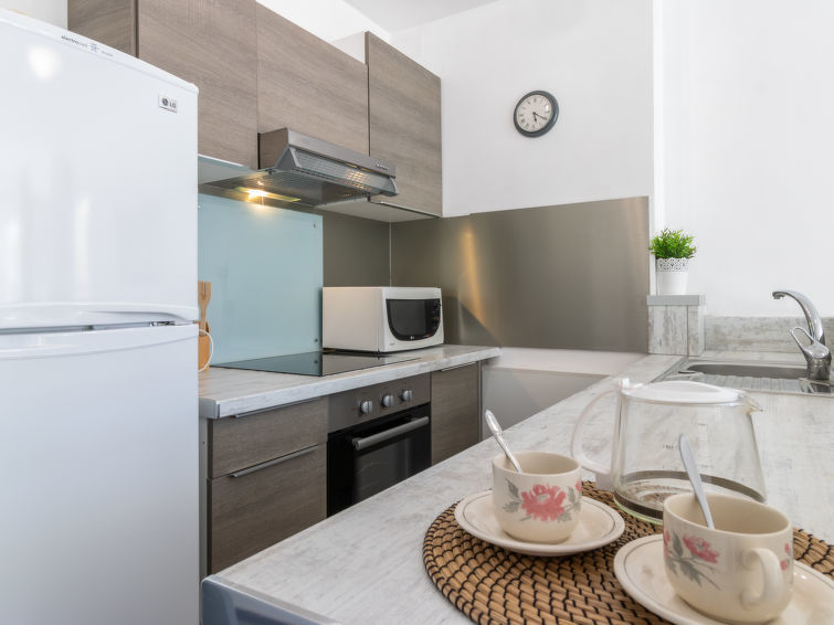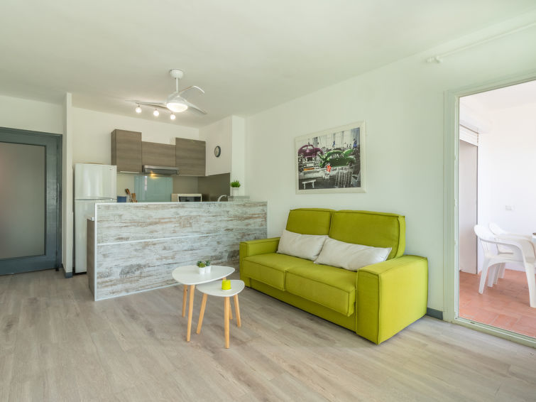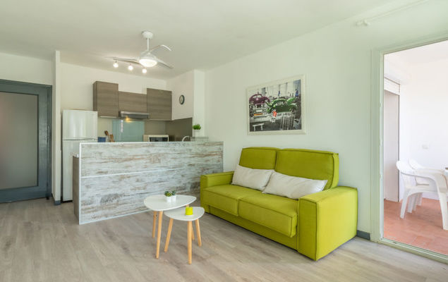 Appartement 4-kamers 70 m2 op de 1e verdieping. Ruim en licht, doelmatig en comfortabel ingericht: woon-/eetkamer met eettafel, Sat-TV, Digitale TV, air-conditioning, ventilator en heteluchtverwarming. Uitgang naar het balkon. 1 kamer met 1 2-pers bed (135 cm). 1 kamer met 1 2-pers bed (135 cm), air-conditioning en heteluchtverwarming. 1 kinderkamer met 1 x 2 stapelbedden (90 cm). Open keuken (oven, afwasmachine, 3 inductiekookplaten, broodrooster, waterkoker, magnetron, diepvriezer, elektrische koffiemachine). Bad/WC, douche/WC. Parketvloeren. Klein terras 5 m2. Terrasmeubelen. Uitzicht op het zwembad en de tuin. Ter beschikking: wasmachine. Internet (Internet (WiFi), gratis). Let op: 1 huisdier/hond toegestaan. TV alleen FR, ES. HUTG044023