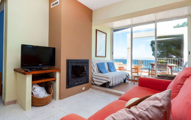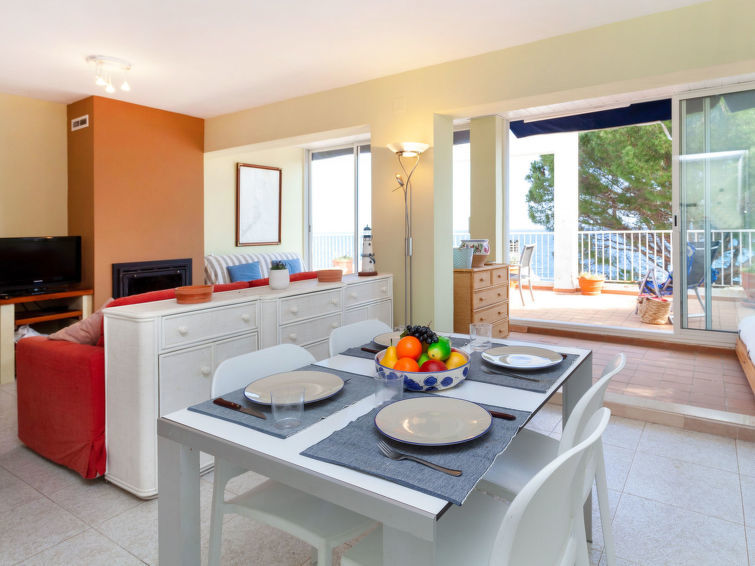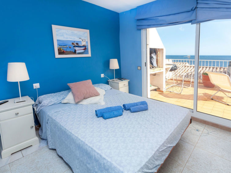"El Niu", dakappartement 3-kamers 59 m2. Doelmatig en gezellig ingericht: woon-/eetkamer met open haard, Digitale TV en Flatscreen TV. Uitgang naar het terras. 1 kamer met 1 2-pers bed (140 cm), Digitale TV. Uitgang naar het terras. 1 kamer met 1 bed (90 cm), 1 x 2 stapelbedden (90 cm). Open keuken (oven, 4 keramische glas kookplaten, magnetron, elektrische koffiemachine). Bad/bidet/WC. Groot terras 30 m2. Terrasmeubelen, barbecue. Mooi uitzicht op zee. Ter beschikking: wasmachine. Let op: geschikt voor families. TV alleen ES. HUTG054508