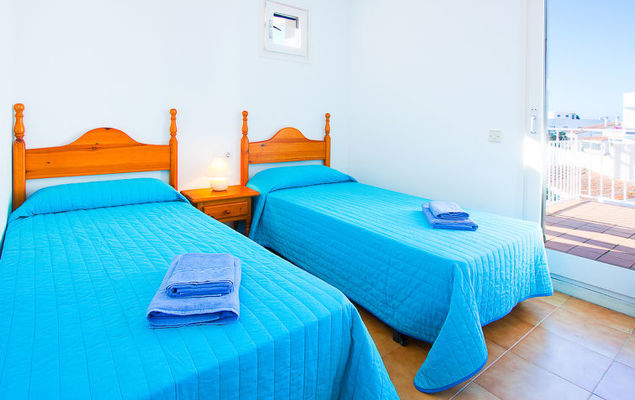 Dakappartement 3-kamers 65 m2 op de 2e verdieping. Licht, doelmatig en comfortabel ingericht: woon-/eetkamer met 1 2-pers divanbed en TV. Uitgang naar het terras. 1 kamer met 1 2-pers bed. 1 kamer met 2 bedden. Open keuken (3 keramische glas kookplaten, magnetron, diepvriezer, elektrische koffiemachine) met bar. Douche/WC, aparte WC. Terras 35 m2. Terrasmeubelen. Ter beschikking: wasmachine. Internet (Internet (WiFi), gratis). Let op: TV alleen ES, DE, FR. HUTG007527