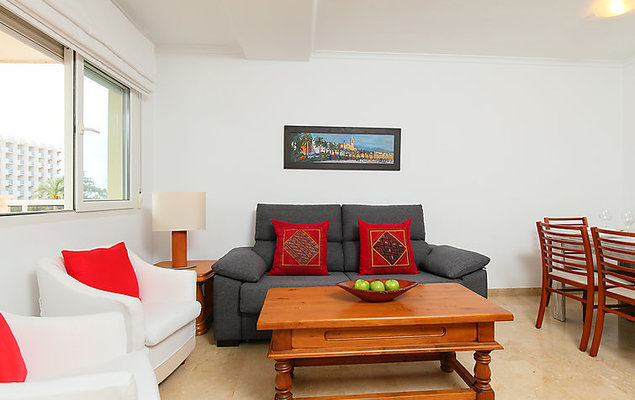 "Estrella del Mar", appartement 3-kamers op de 2e verdieping, op het noordwesten gelegen. Ruim, zeer comfortabel en modern ingericht: woon-/eetkamer met Sat-TV en internationale TV-zenders (Flatscreen TV), air-conditioning en heteluchtverwarming. Uitgang naar het terras. 1 kamer met 1 2-pers bed, bad/bidet/WC, air-conditioning en heteluchtverwarming. 1 kamer met 2 bedden (90 cm), air-conditioning en heteluchtverwarming. Keuken (oven, afwasmachine, 4 keramische glas kookplaten, magnetron, diepvriezer, elektrische koffiemachine). Bad/bidet/WC. Ter beschikking: wasmachine, strijkijzer, haardroger. Internet (Internet (WiFi), gratis). Garage. Let op: niet rokers woning. 1 huisdier/hond toegestaan. AT-447361-A