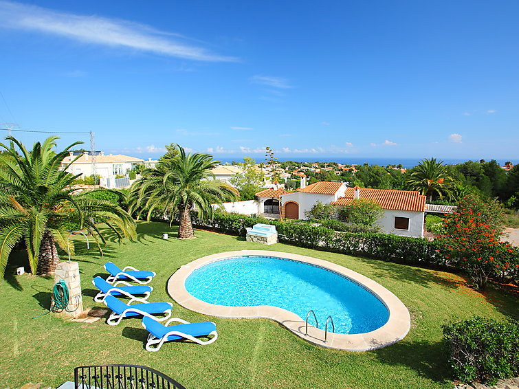 Bellavista: Huis "Avellana". Buiten de plaats, 4.5 km van het centrum van Denia, tegen een helling, 3 km van zee, aan een doodlopende weg. Voor alleengebruik: tuin met gazon en planten, openluchtzwembad niervormig (4 x 8 m, 80 - 180 cm diepte, 01.01.-31.12.). Barbecue. Trappenweg naar het huis. Overdekte parkeerplaats. Supermarkt 1.5 km, zandstrand 4.5 km. De eigenaar accepteert geen jeugdgroepen.